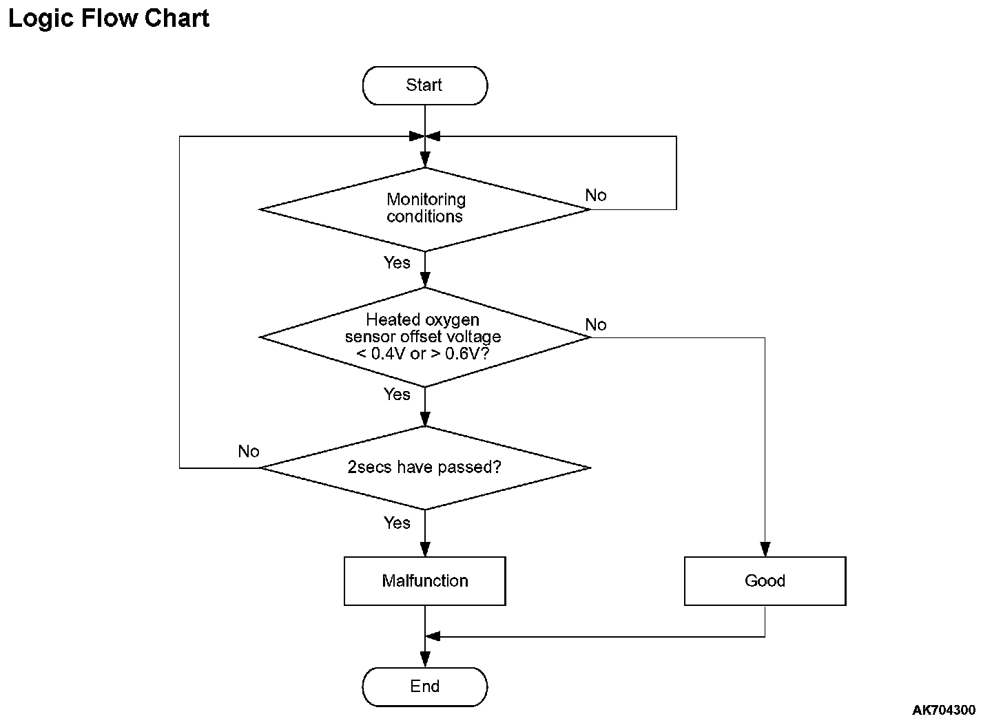 - Heated oxygen sensor offset voltage is more than 0.6 volt for 2 seconds.