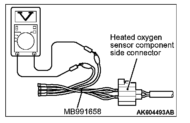1. Disconnect the heated oxygen sensor (3rd) connector D-31 and connect test harness special tool MB991658 to the connector on the heated oxygen sensor (3rd) side.