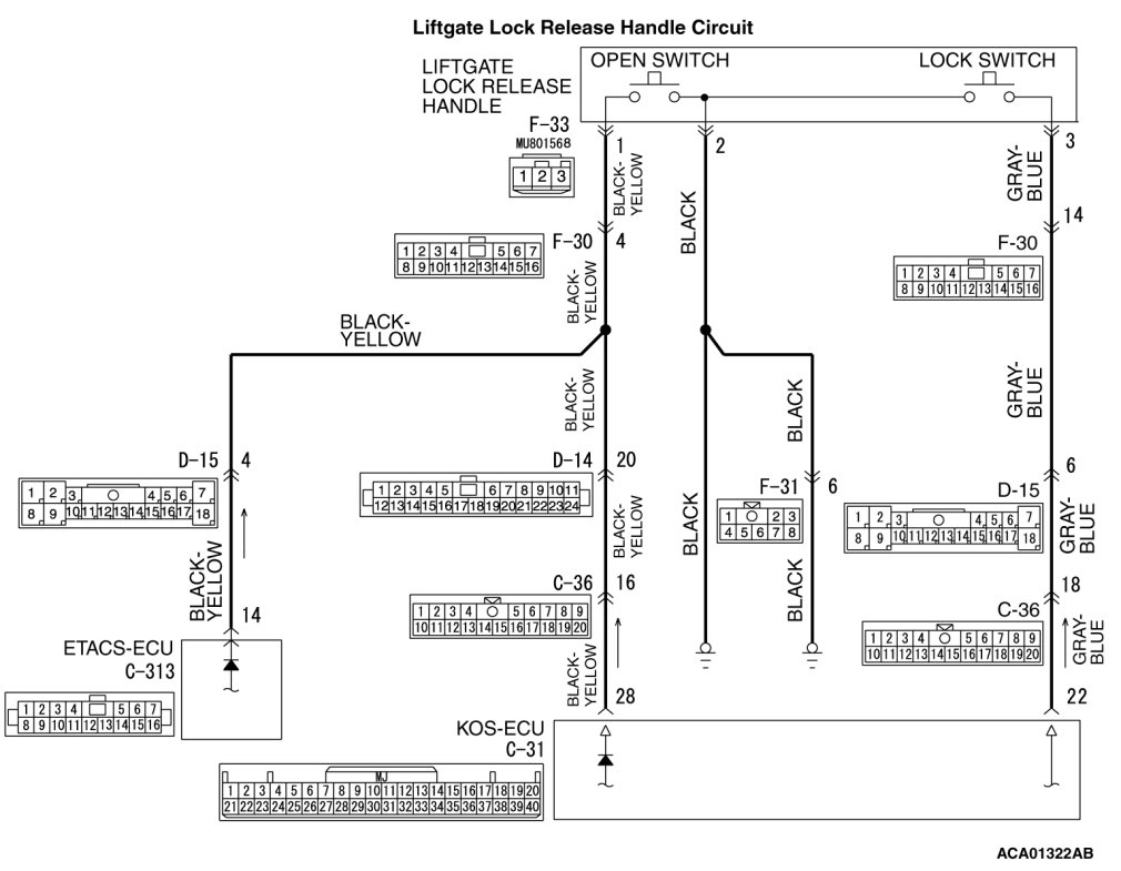STEP 6. Check the wiring harness between liftgate lock release handle connector F-33 (terminal 1) and ETACS-ECU connector C-313 (terminal 14).