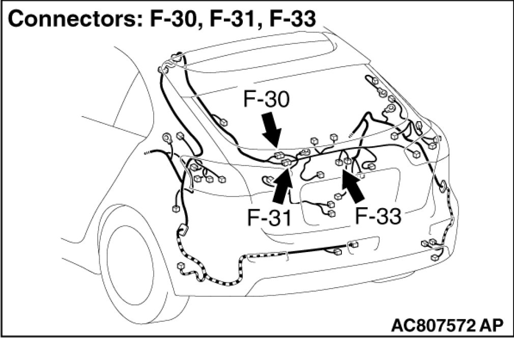 STEP 1. Check liftgate lock release handle connector F-33 for loose, corroded or damaged terminals, or terminals pushed back in the connector.