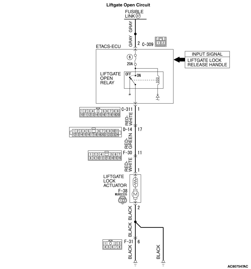 STEP 9. Check the wiring harness between ETACS-ECU connector C-311 (terminal 1) and liftgate lock actuator connector F-38 (terminal 1).