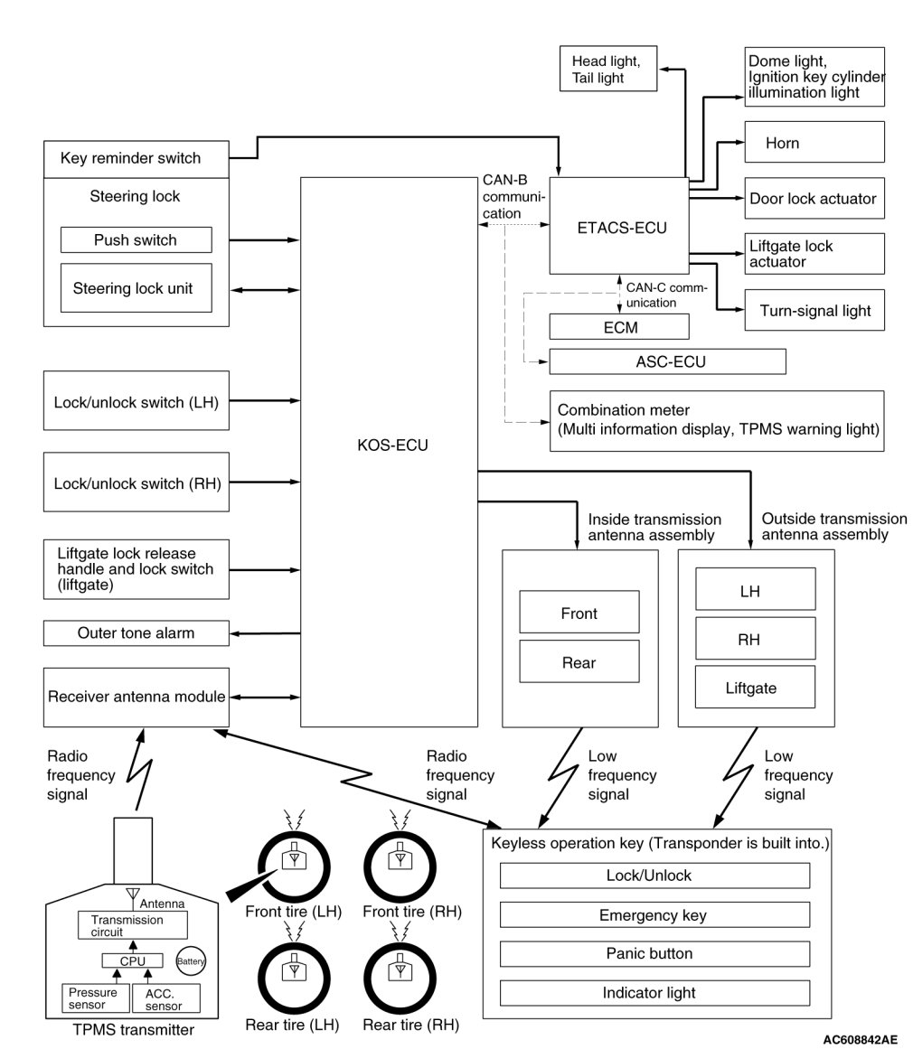 (opening/closing of all doors, opening of trunk lid [LANCER] or liftgate [LANCER SPORTBACK], and operation of warning function that warns a person who intends to damage the vehicle *) by operating the lock/unlock /trunk lid [LANCER] button and panic button on the keyless operation key. The system also incorporates the immobilizer function that prohibits the starting of engine by using an unauthorized key as well as the tire pressure monitoring system (TPMS) that issues a warning to a driver by illuminating or flashing the warning light if an abnormality to the tire pressure or system is detected. KOS has the following features: