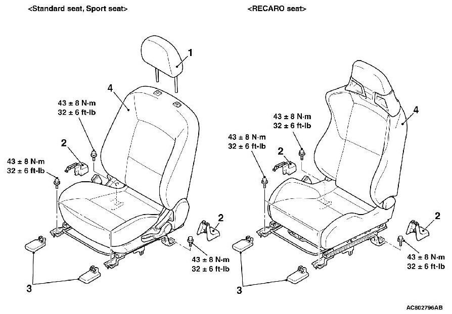 Before removing the front seat assembly, refer to Service precautions Technician Safety Information and Side-airbag module (S) Removal and Installation [Except for RALLIART] Removal and Installation [RALLIART].