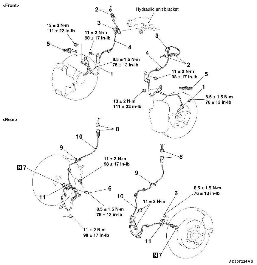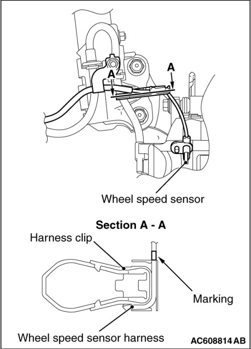 Install the front wheel speed sensor to the harness clip as shown in the figure.