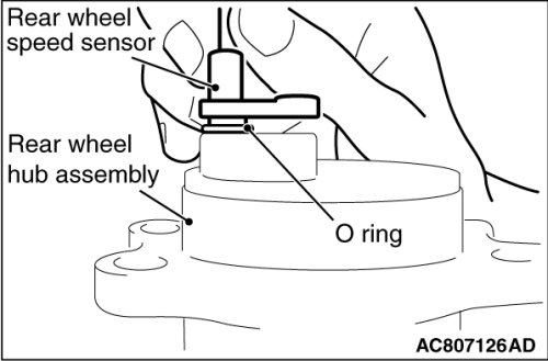 - Do not insert the rear wheel speed sensor at an angle or by prying the sensor because it may be possible that the O-ring of rear wheel speed sensor cannot be mounted properly.