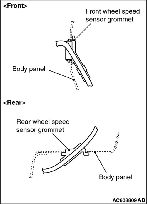 Install the front wheel speed sensor grommet and the rear wheel speed sensor grommet to the body panel snugly as shown in the figure.