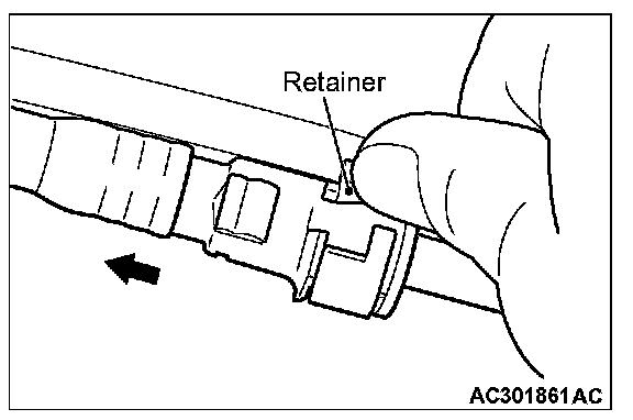 2. Raise the retainer of the fuel high-pressure hose and pull out the fuel high-pressure hose in the direction shown in the figure.