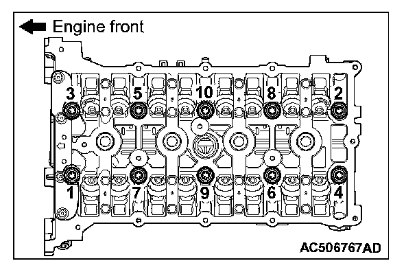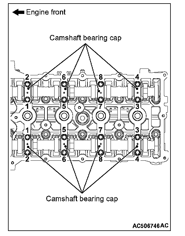 Loosen the camshaft bearing cap mounting bolts in the order of number shown in the figure in four or five steps, and remove the camshaft bearing caps.
