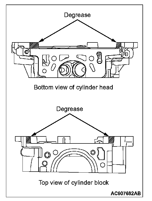 1. Remove the sealant and grease on the top surface of cylinder block and on the bottom surface of the cylinder head. Then, degrease the sealant application surface.