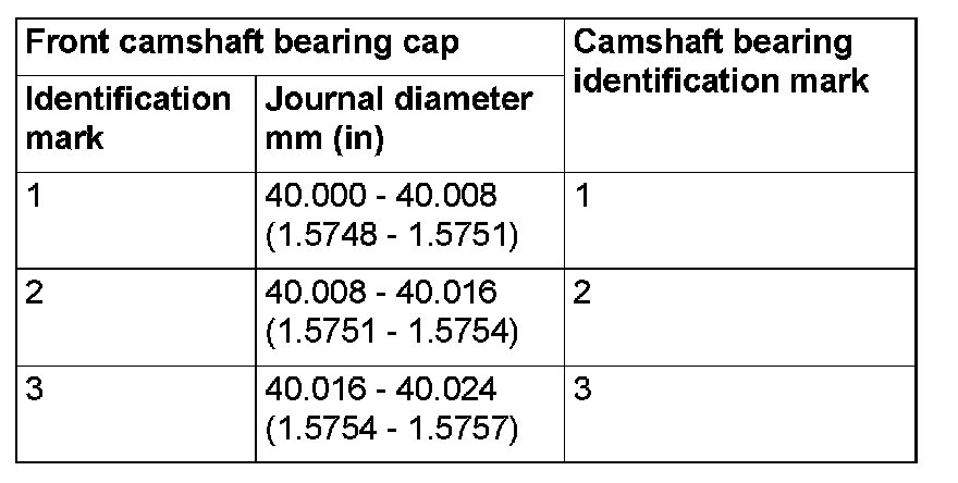 When replacing the camshaft bearing, according to the identification mark of front camshaft bearing cap in the table below, select a camshaft bearing with the corresponding size. Note that the identification mark of camshaft bearing is stamped on the place shown in the figure.