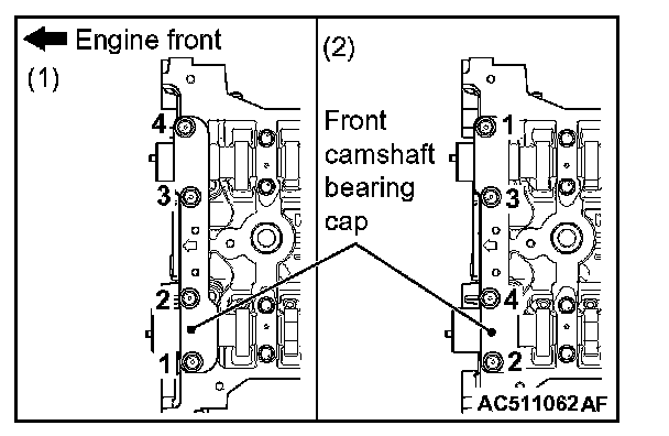 2. Tighten the front camshaft bearing cap mounting bolts again to the specified torque in the order of the figure (2.)
