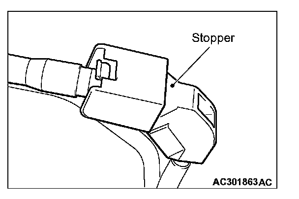 After connecting the fuel high-pressure hose, slightly pull it in the pull-out direction to check that it is installed firmly. In addition, check that there is approximately 1 mm (0.04 inch) play. After the check, install the stopper securely.