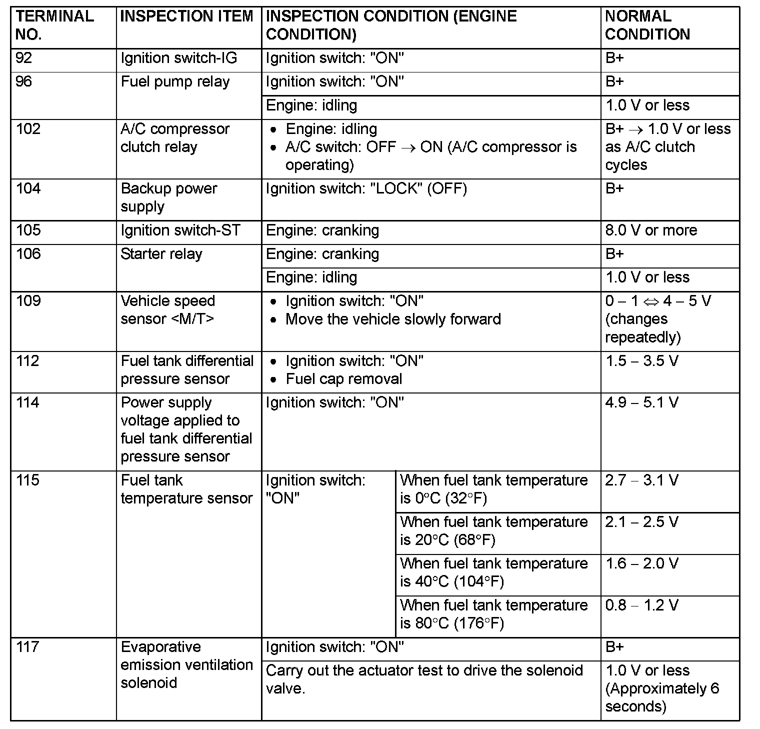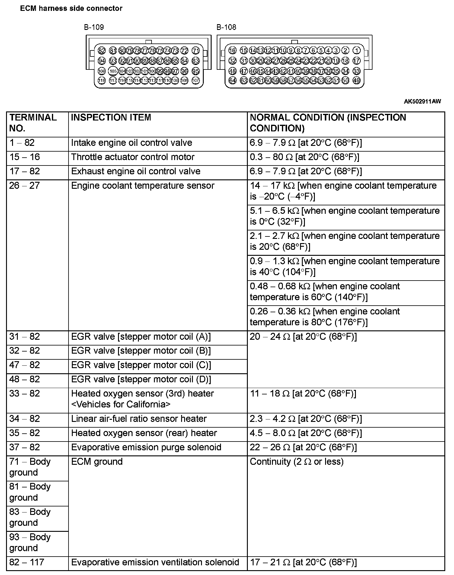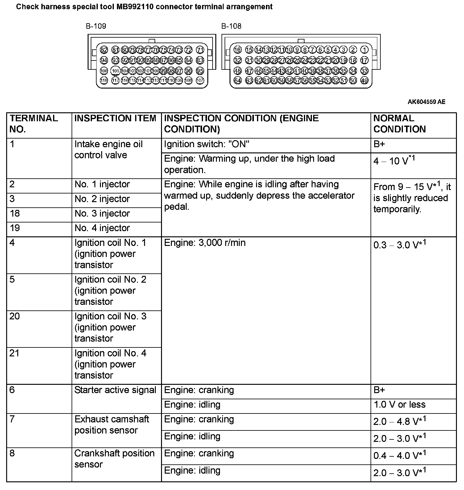 CHECK AT THE ENGINE CONTROL MODULE (ECM)1. Disconnect the ECM connectors B-108 and B-109, and connect check harness special tool MB992110 between the ECM connectors.