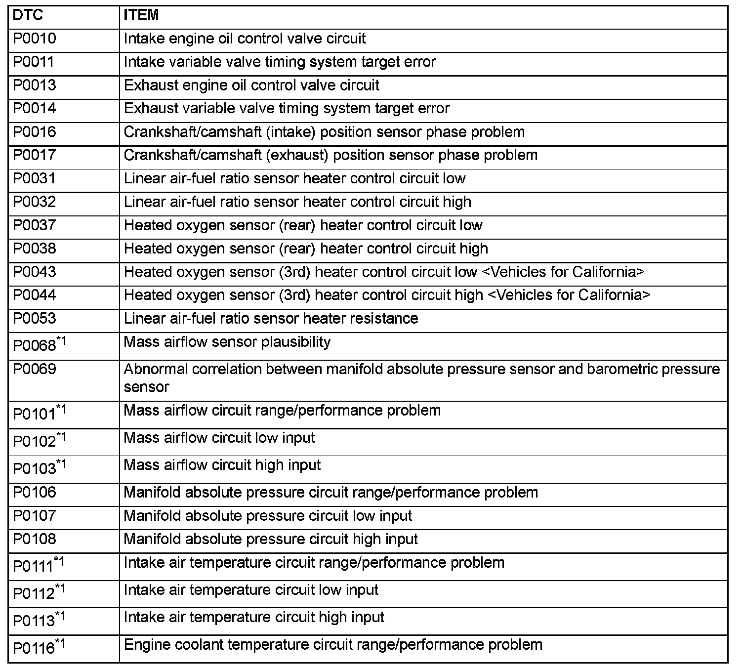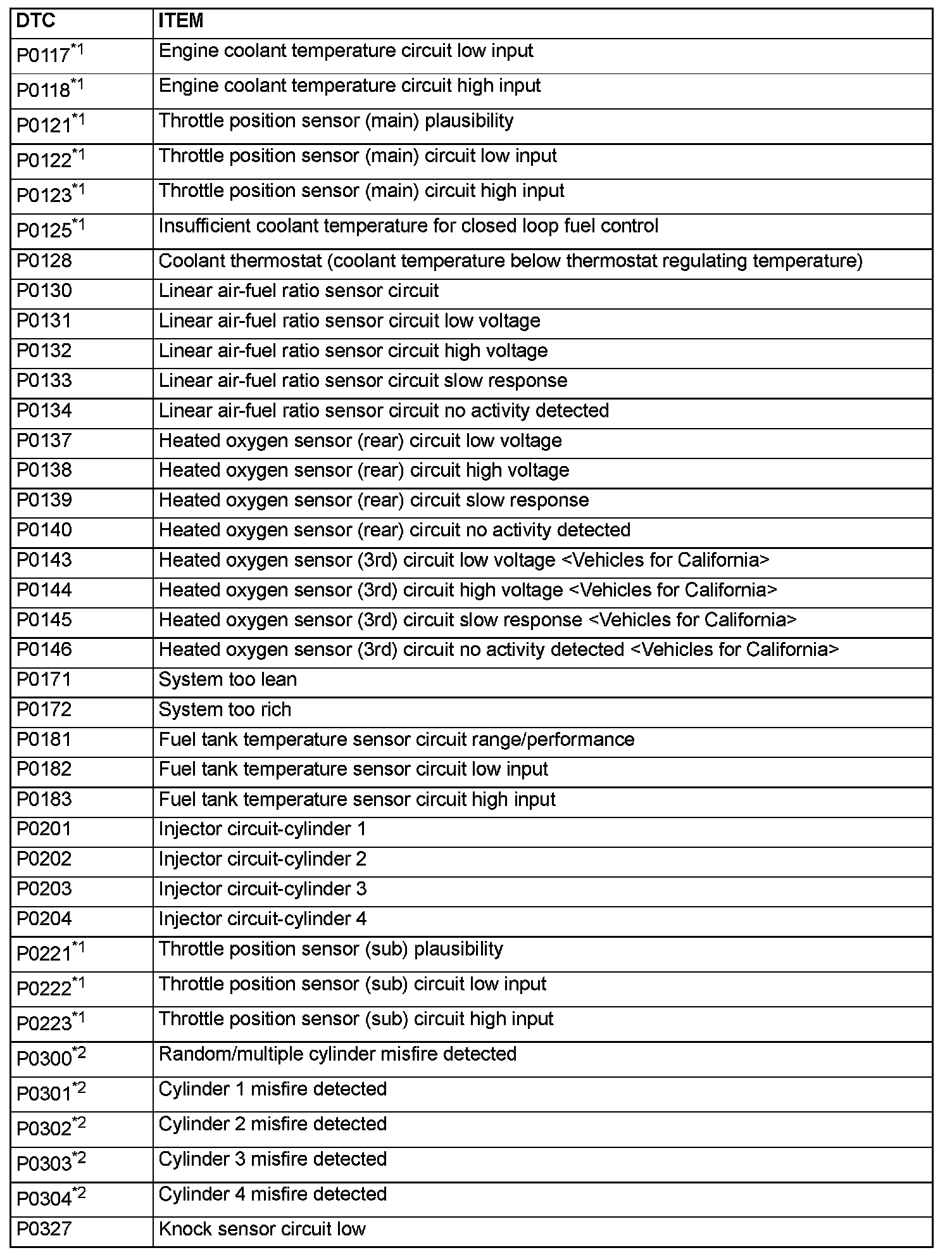 - The codes marked with a "*2" in the diagnosis code number column have the following two conditions for illuminating the Malfunction Indicator Lamp (SERVICE ENGINE SOON or Check Engine Lamp).
