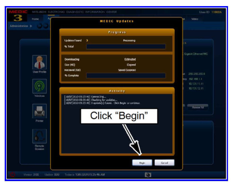 4. If the MEDIC update screen advises updates are available, click the "Begin" button. After all updates are complete, GO TO THE REPROGRAMMING PROCEDURE.