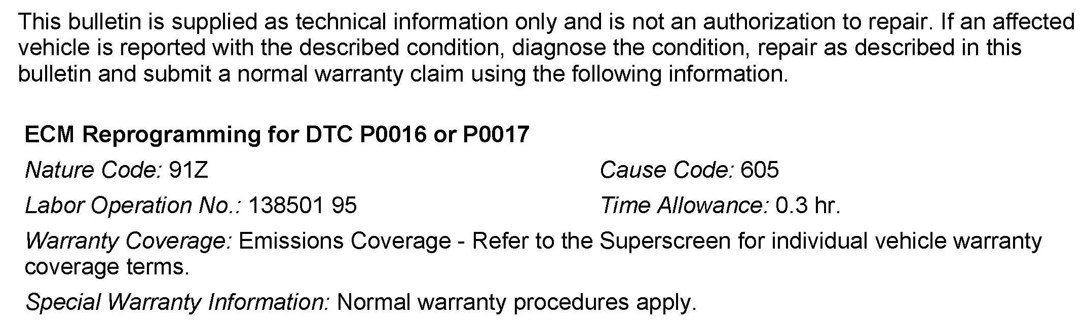 Some affected vehicles may display an illuminated MIL with DTC P0016 Crankshaft/Camshaft Intake Position or P0017 - Crankshaft/Camshaft Exhaust Position Sensor Phase Problem recorded in the ECM. An incorrect parameter in the judgment criteria may cause mis-detection of a fault without there being an abnormal condition.