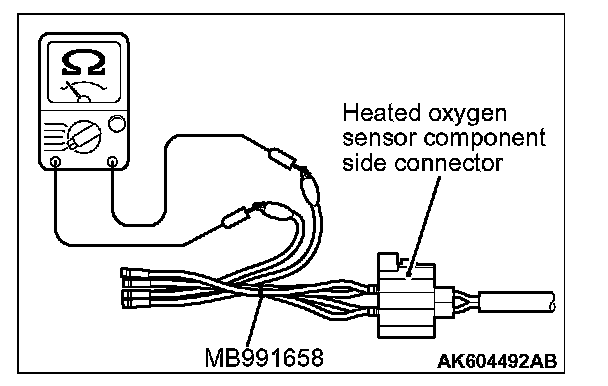 1. Disconnect the heated oxygen sensor connector and connect special tool MB991658 to the connector on the heated oxygen sensor side.