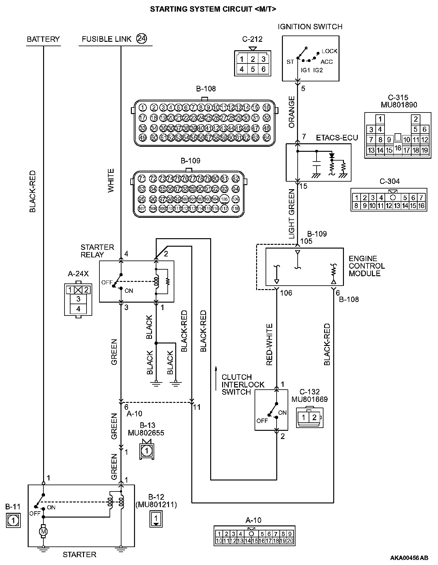 STEP 22. Check for open circuit and short circuit to ground between clutch interlock switch connector C-132 (terminal No. 2) and starter relay connector A-24X (terminal No. 2).