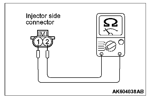 2. Measure the resistance between each injector side connector terminal No. 1 and No. 2.
