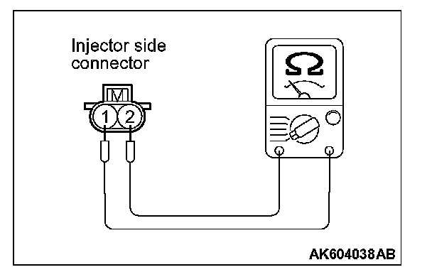2. Measure the resistance between each injector side connector terminal No. 1 and No. 2.