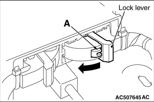 (1)While pushing the part "A" indicated in the figure of the harness side connector, turn the lock lever to the direction of the arrow to release the lock lever, and disconnect the C-122 SRS-ECU connectors.