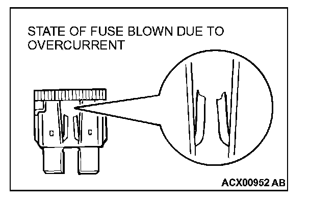 CAUTIONS IN EVENT OF BLOWN FUSEWhen a fuse is blown, there are two probable causes. One is that it is blown due to flow of current exceeding its rating. The other is that it is blown due to repeated on/off current flowing through it. Which of the two causes is responsible can be easily determined by visual check as described below.