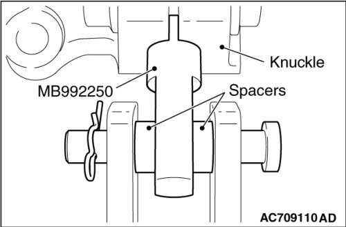 2. Insert special tool MB992250 in the knuckle and tighten it with a bolt and nut.