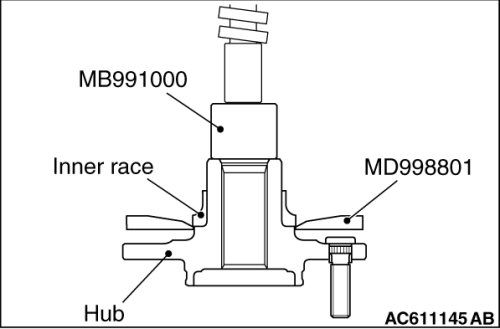 1. Use special tools MD998801 and MB991000 to remove the wheel bearing inner race (outside) from the hub.