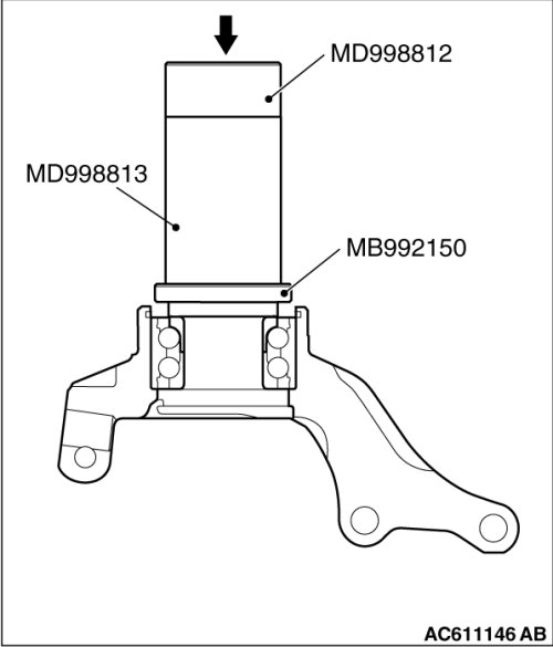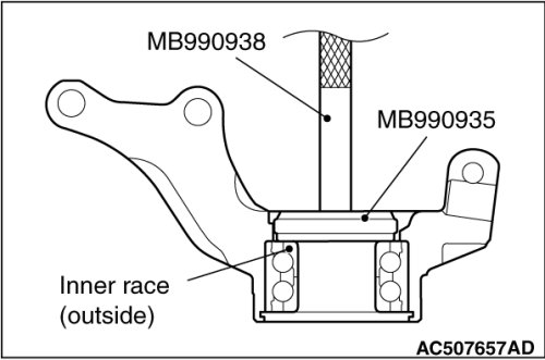 2. Use special tools MB992150, MD998812 and MD998813 to assemble the inner race (outside) removed from the hub to the wheel bearing.
