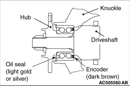 - The magnetic encoder for wheel speed sensor is installed in the wheel bearing. Install the wheel bearing so that the encoder is positioned in the direction shown in the figure.