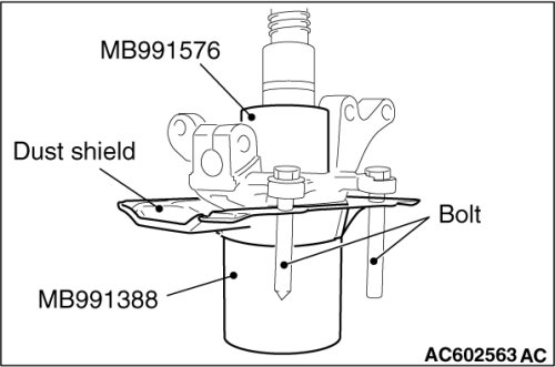 Use special tools MB991388 and MB991576 to press-fit the knuckle into the dust shield.