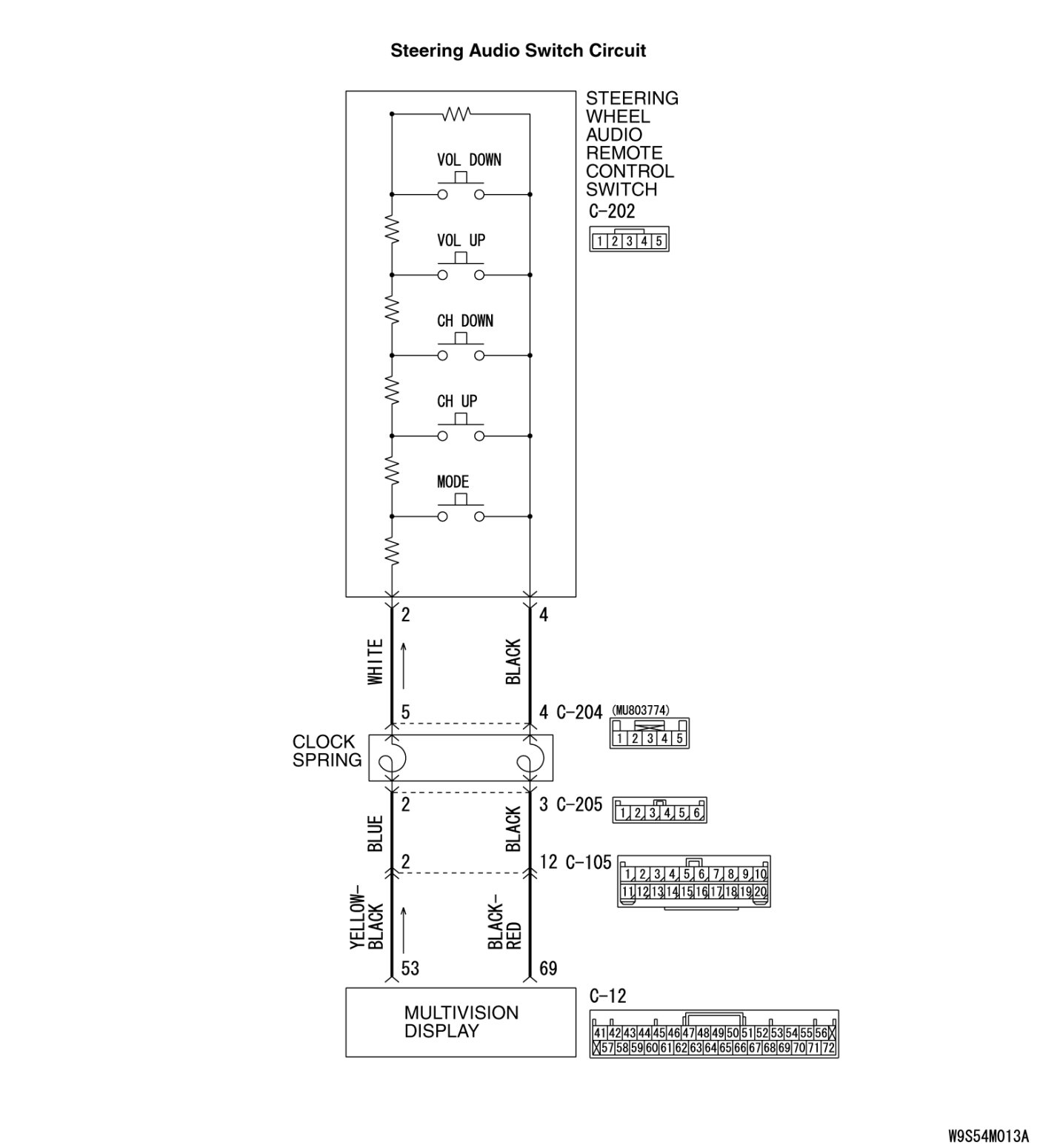 The power supply circuit to the steering wheel audio remote control switch, the steering wheel audio remote control switch, the multivision display, or the clock spring may be defective.