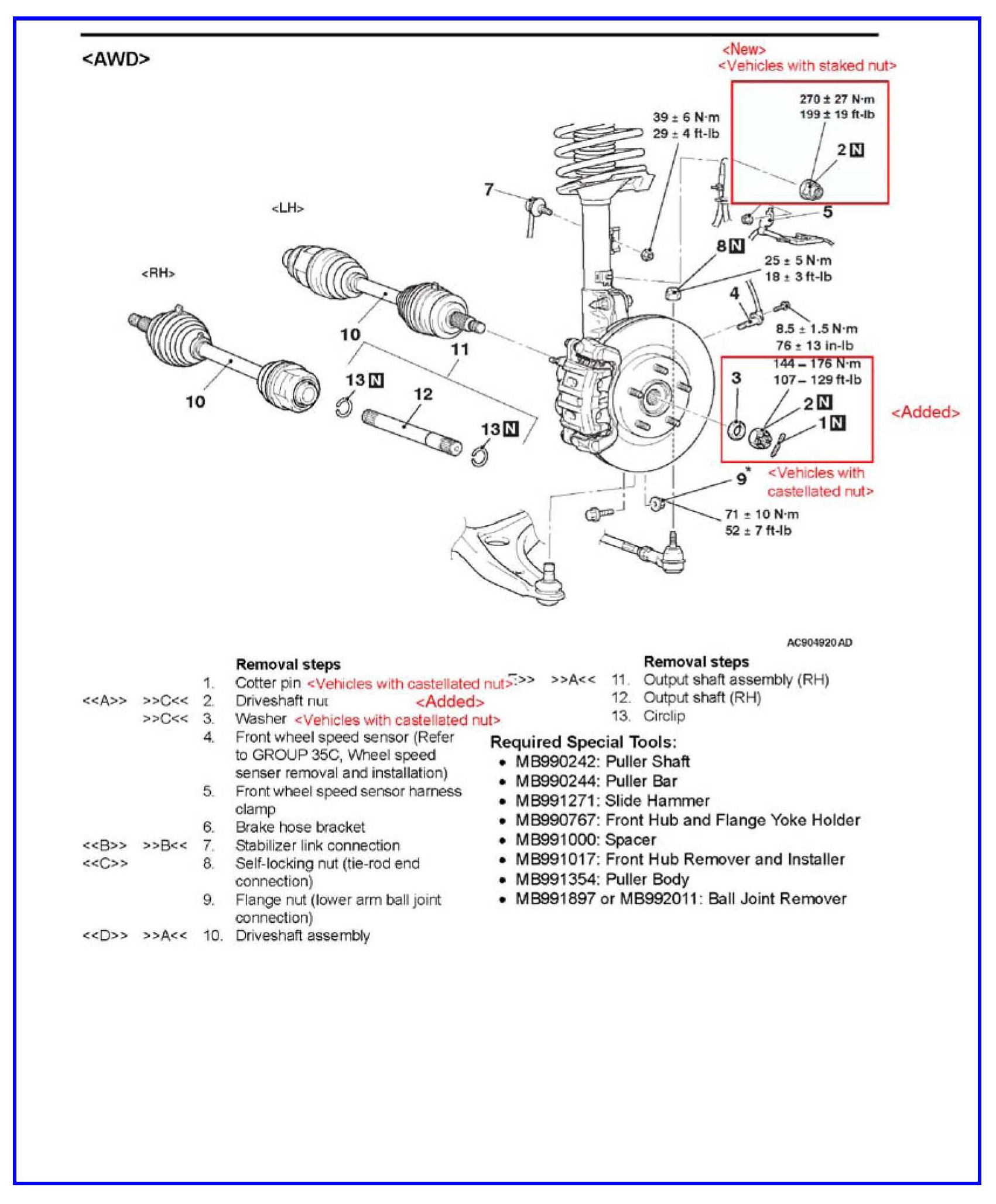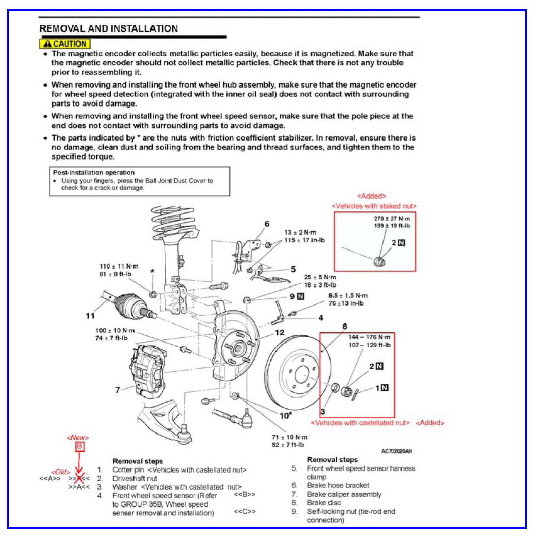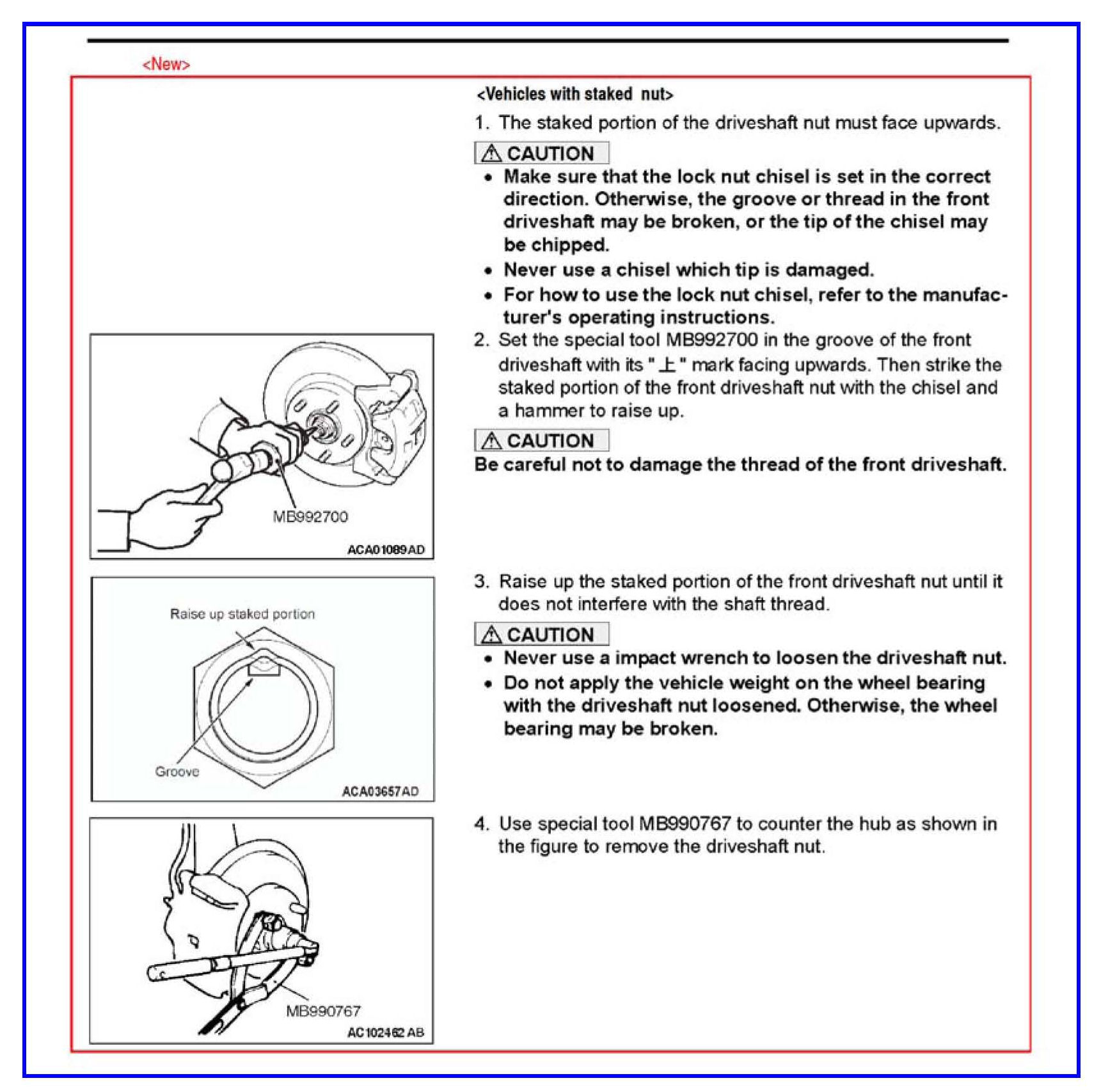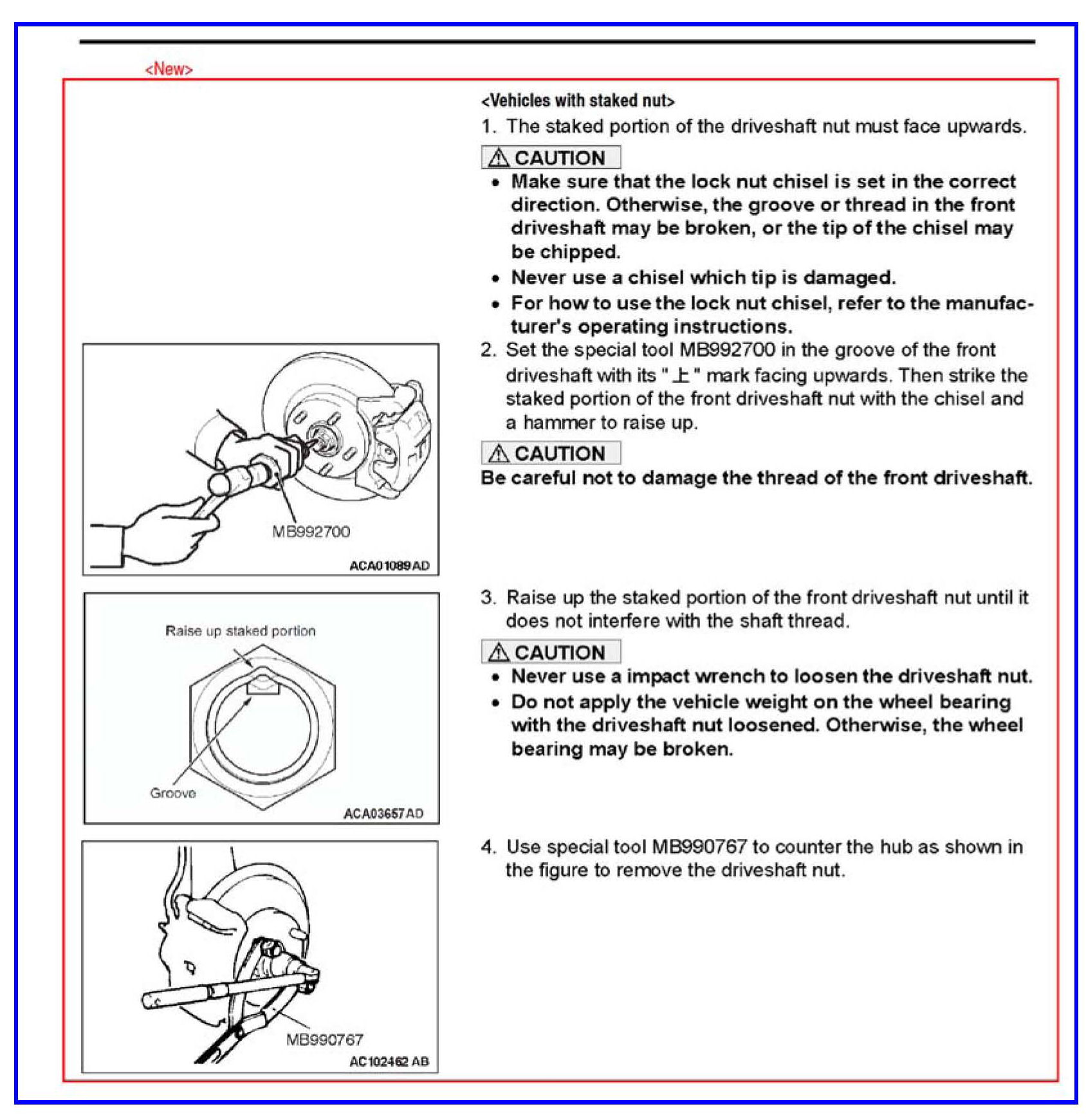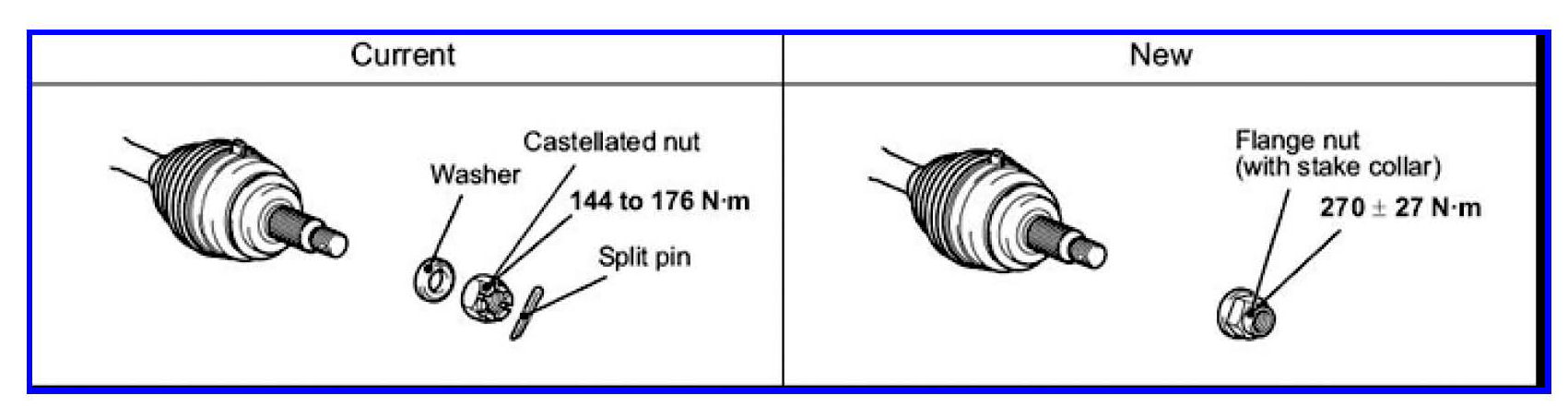 The front axle nut has been changed in production from castellated type to flanged type with a staked collar. This TSB contains new service manual procedures for vehicles related to this change.