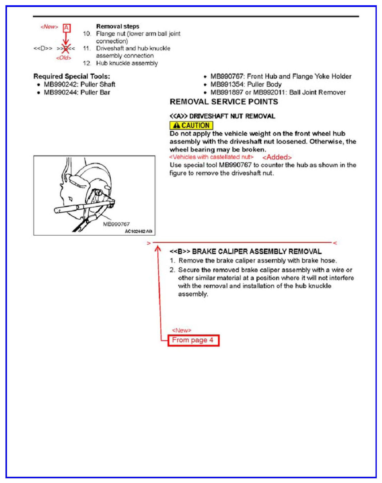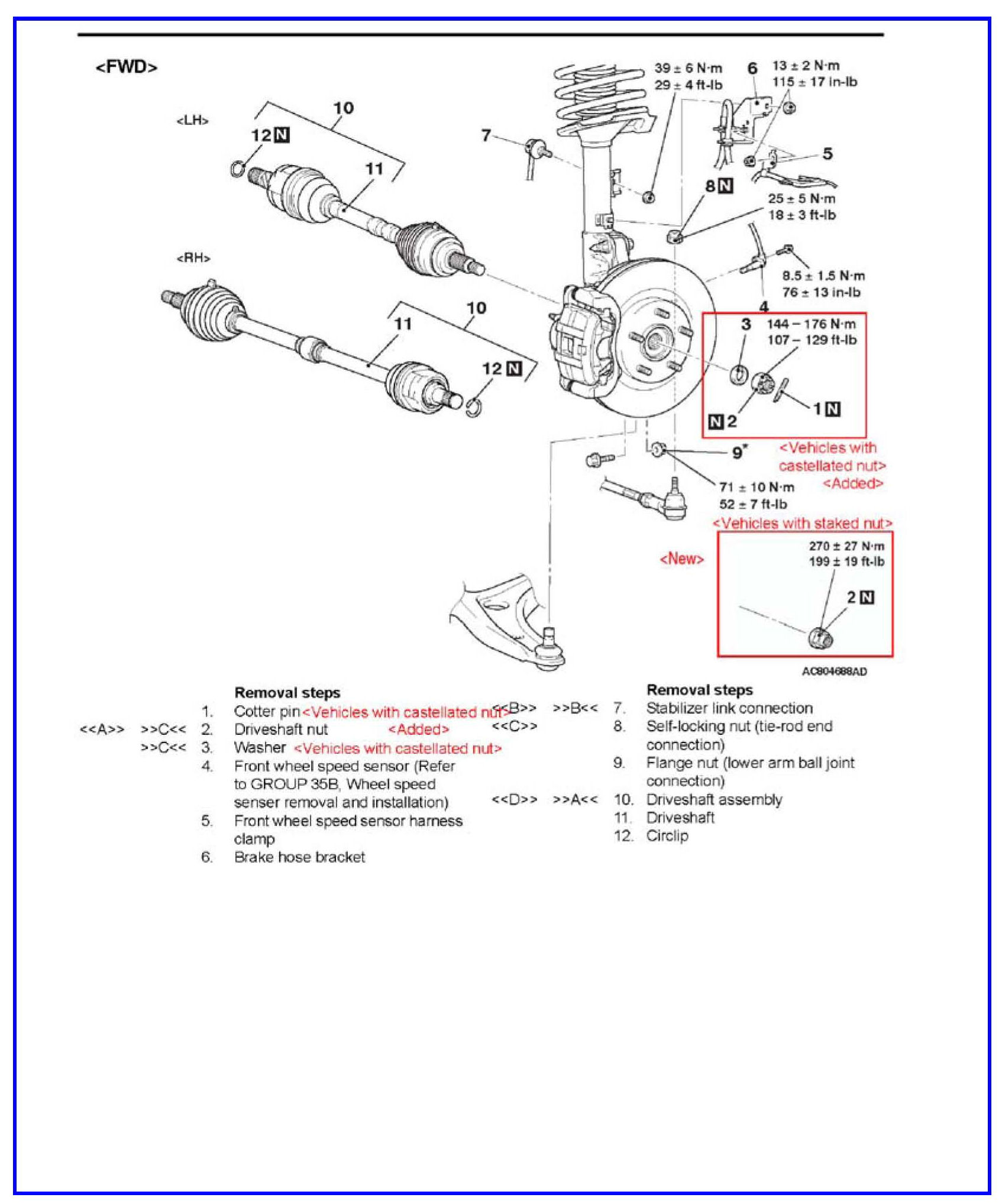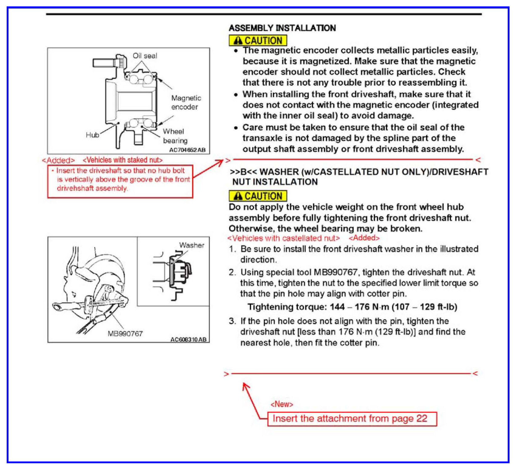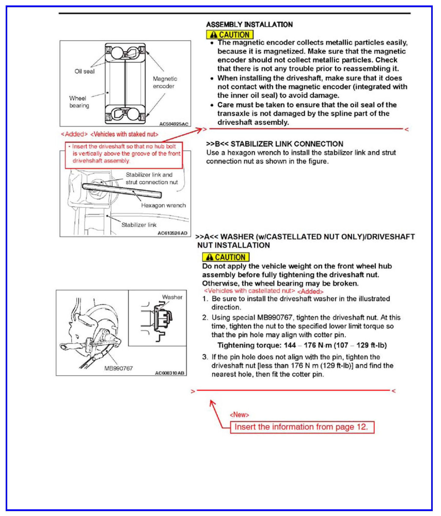 The front axle nut has been changed in production from castellated type to flanged type with a staked collar. This TSB contains new service manual procedures for vehicles related to this change.