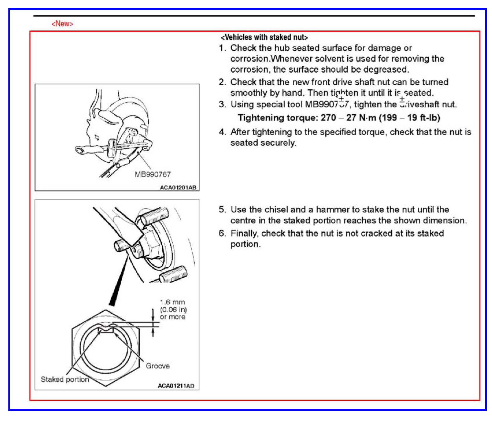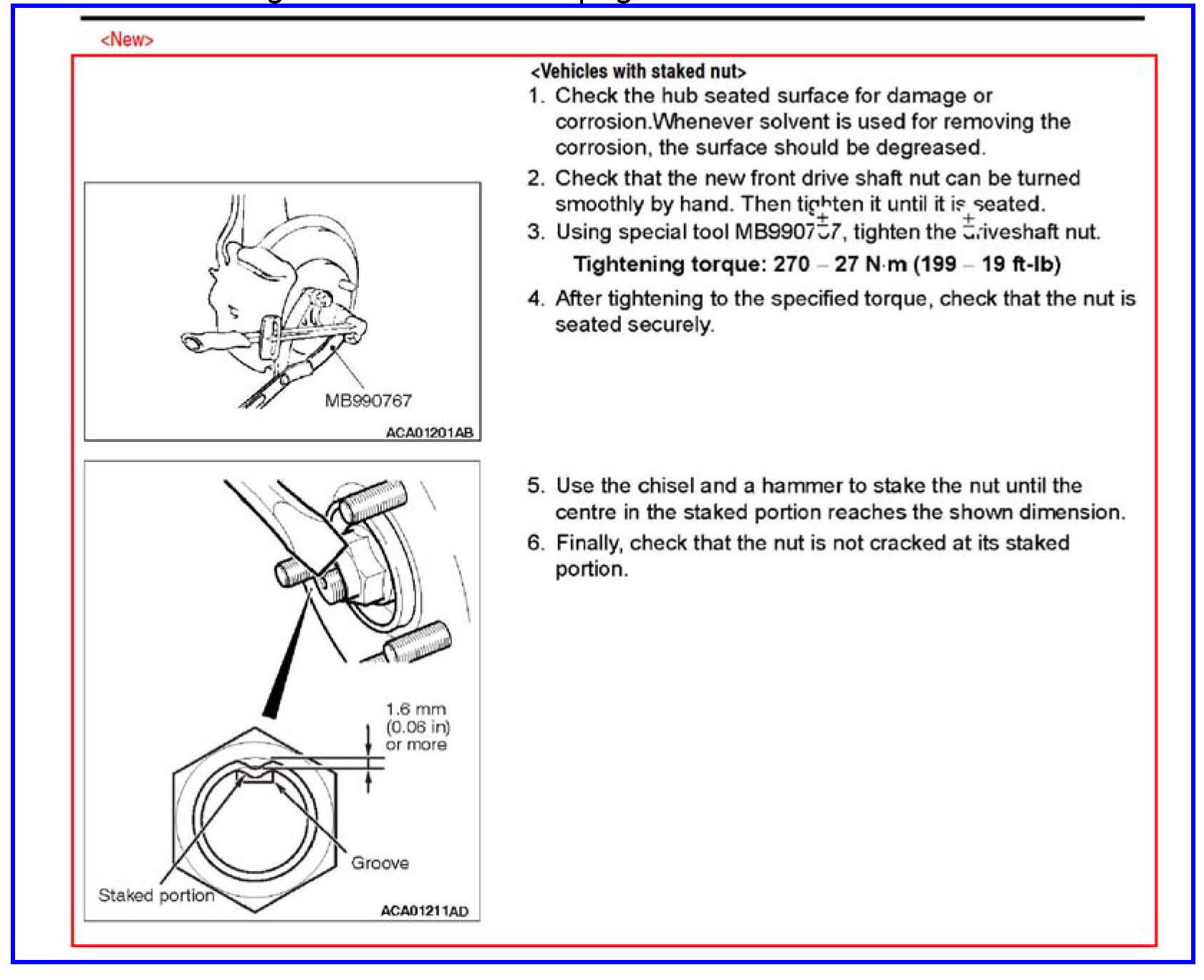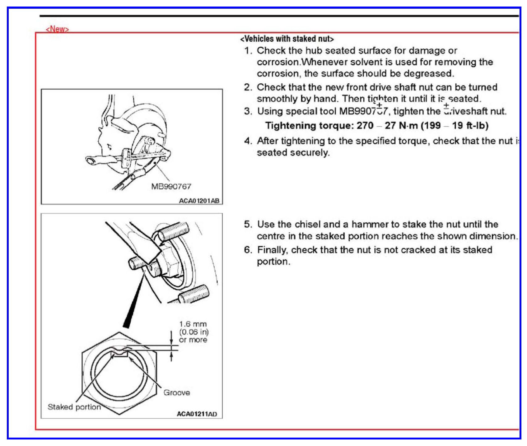 ^ Tightening torque for staked nuts (144 - 176 Nm -> 270 +/- 27 Nm)