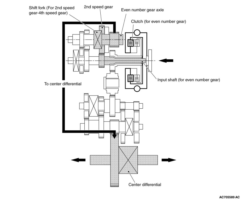 The clutch (for odd number gears) is released at the shifting timing in accordance with the shift map, and the clutch (for even number gears) is engaged to perform driving with the 2nd gear.