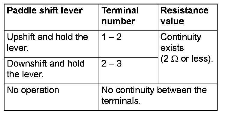 3. Check the continuity between the paddle shift switch connector terminals.
