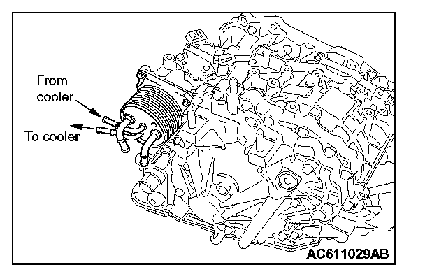 1. Disconnect the OUTLET line (from cooler) at the transaxle and place a collecting container under the disconnected line.