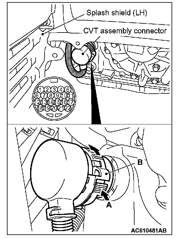 TRANSMISSION FLUID TEMPERATURE SENSOR CHECK1. While pressing A in the figure, turn B counterclockwise to unlock the CVT assembly connector, and disconnect the connector.