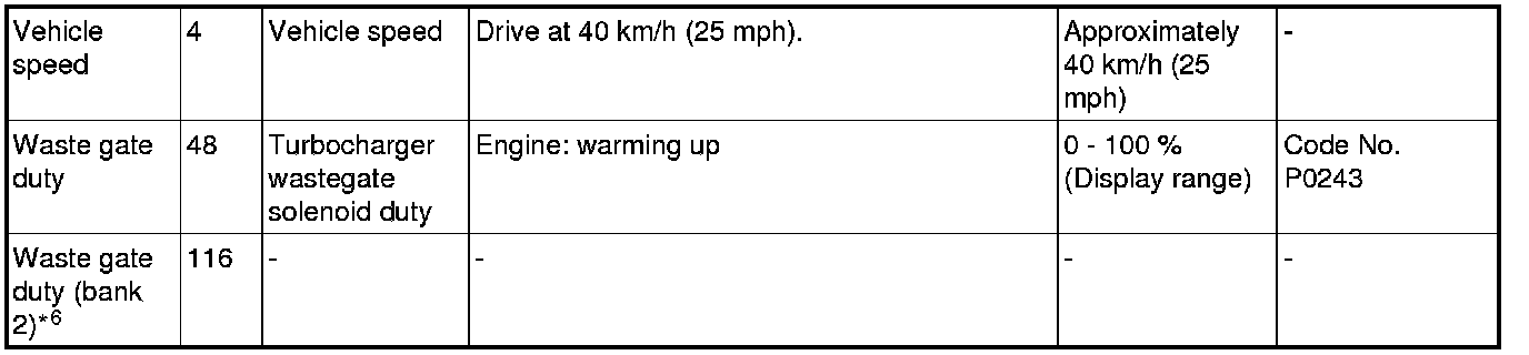 *6: Data item is displayed on scan tool display, but the turbocharger wastegate solenoid 2 is not equipped and its data is displayed as "0 %".