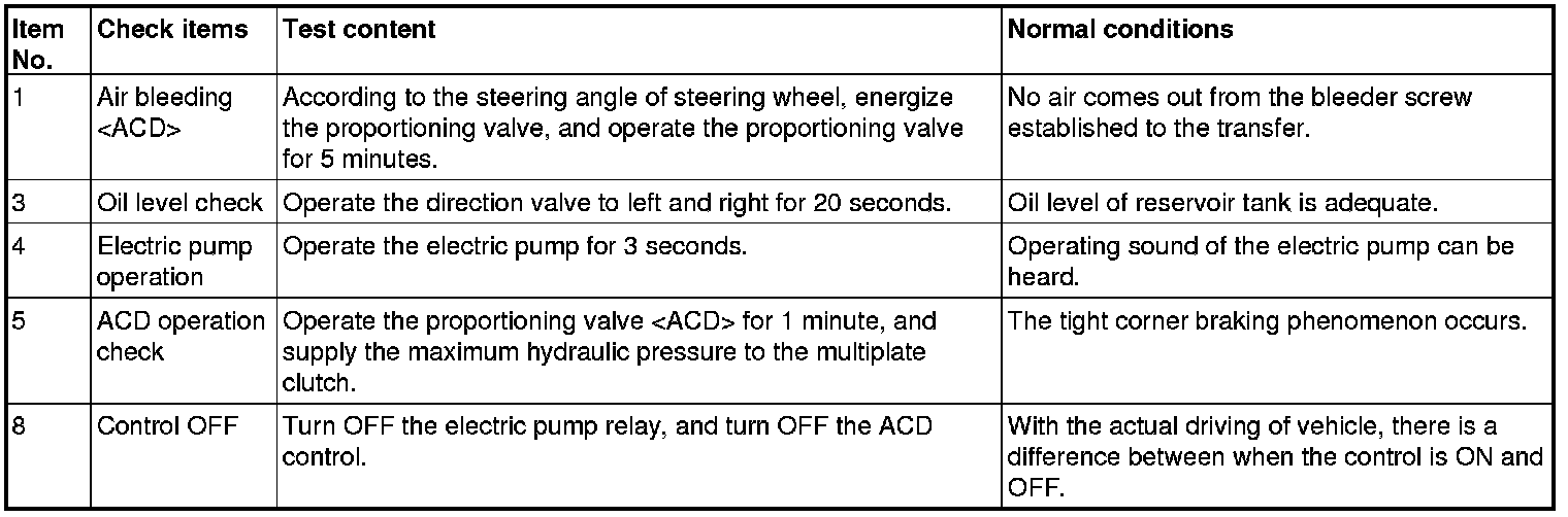 Since the fluid in the hydraulic unit will be hardened under low temperature, all the inspection items in the table may not be checked properly. Therefore, completely remove snow and ice from the hydraulic unit and leave the vehicle under temperature of 0°C (32°F) or higher for 4 hours or more before performing the actuator test.