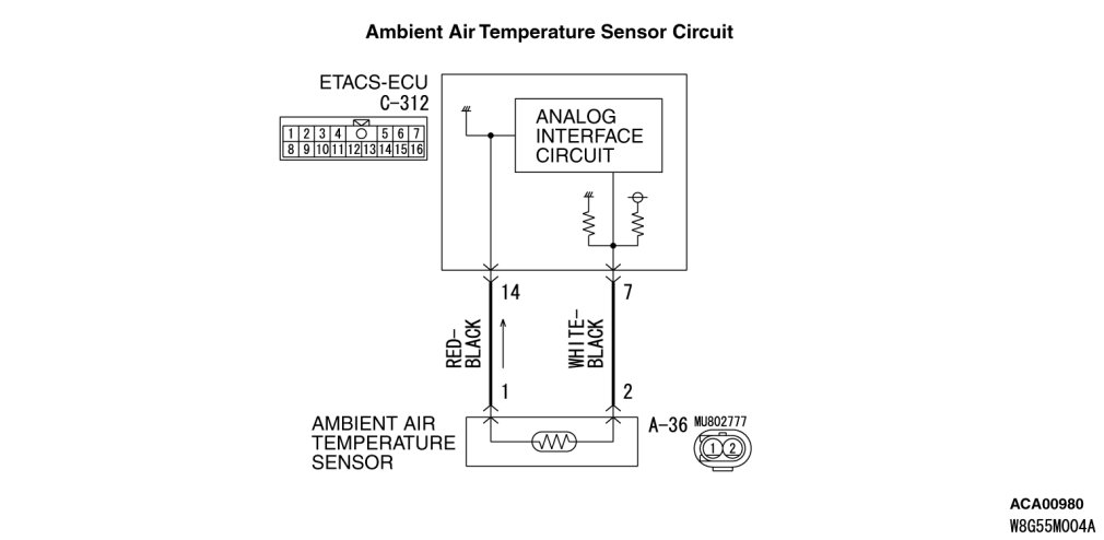 Q. Is the wiring harness between ambient air temperature sensor connector A-36 (terminals 2 and 1) and ETACS-ECU connector C-312 (terminals 7 and 14) in good condition?