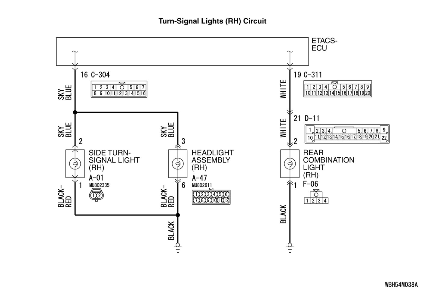 Q. Are the wiring harness between headlight assembly (RH) connector A-47 (terminal 3) [front], side turn-signal light (RH) connector A-01 (terminal 2) [side], rear combination light (RH) connector F-06 (terminal 2) [LANCER (rear)], rear turn-signal light (RH) connector F-36 (terminal 2) [LANCER SPORTBACK (rear)] and ETACS-ECU connector C-304 (terminal 16) [front or side] or C-311 (terminal 19) [rear] in good condition?