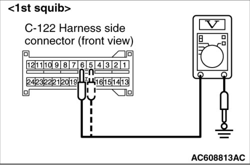 (7)Measure the voltage between C-122 harness side connector terminals 5 and 6 [1st squib] or 9 and 10 [2nd squib] and body ground.