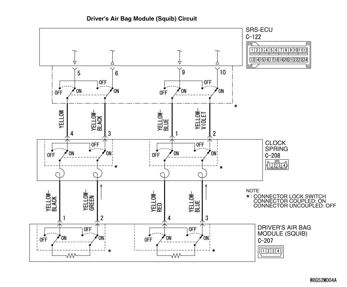 - SRS-ECU connector C-122 (terminal No.6) and the clock spring connector C-208 (terminal No.3) [1st squib]