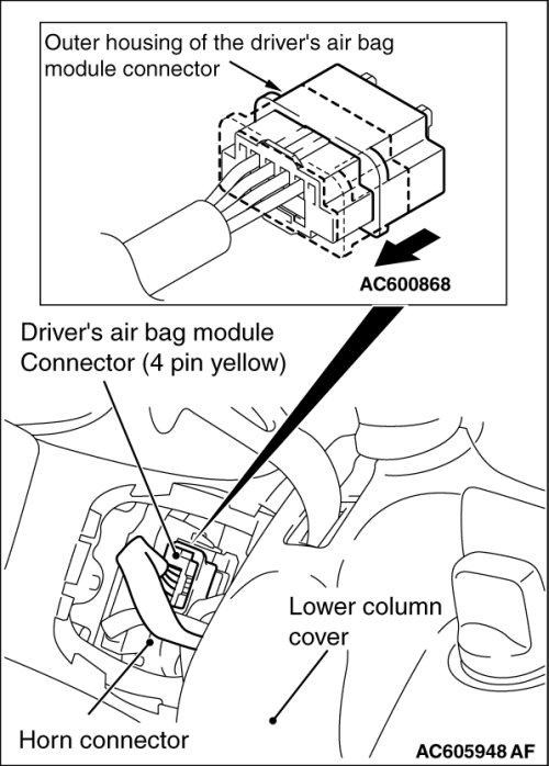 Insert special tool MB991866 into clock spring side of driver's air bag module connector C-207 (terminal No.1 and 2 [1st squib] or terminal No.3 and 4 [2nd squib]) by backprobing.