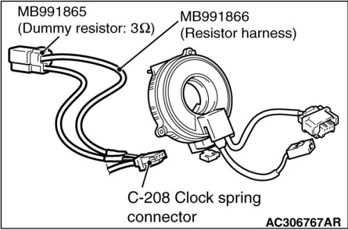 Insert special tool MB991866 into harness side of clock spring connector C-208 (terminal No.3 and 4 [1st squib] or terminal No.1 and 2 [2nd squib]) by backprobing.