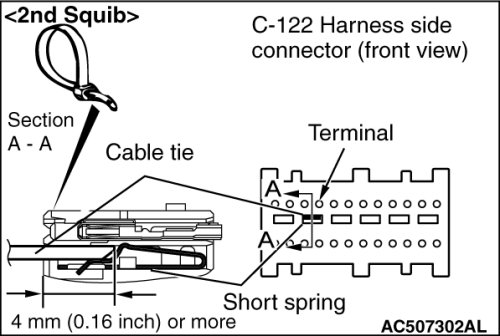 Insert a cable tie [3 mm (0.12 inch) wide, 0.5 mm (0.02 inch) thick] between terminals 5, 6 [1st squib] or 9, 10 [2nd squib] and the short spring to release the short spring.