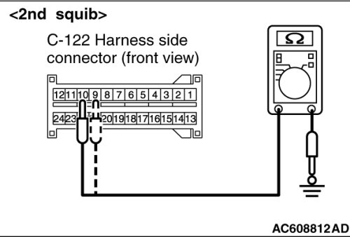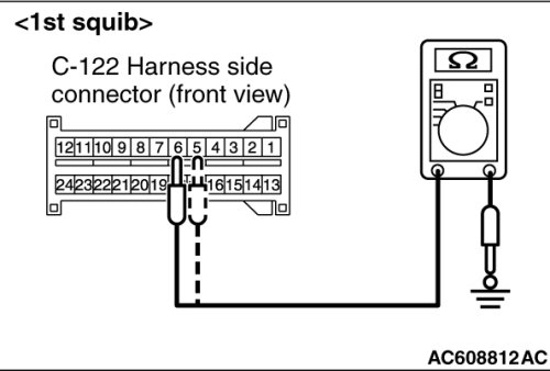 (5)Check for continuity between C-122 harness side connector terminals 5 and 6 [1st squib] or 9 and 10 [2nd squib] and body ground.