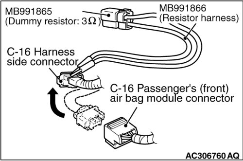 Insert special tool MB991866 into the harness side connector C-16 (terminal No.1 and 2 [1st squib] or terminal No.3 and 4 [2nd squib]) by backprobing.